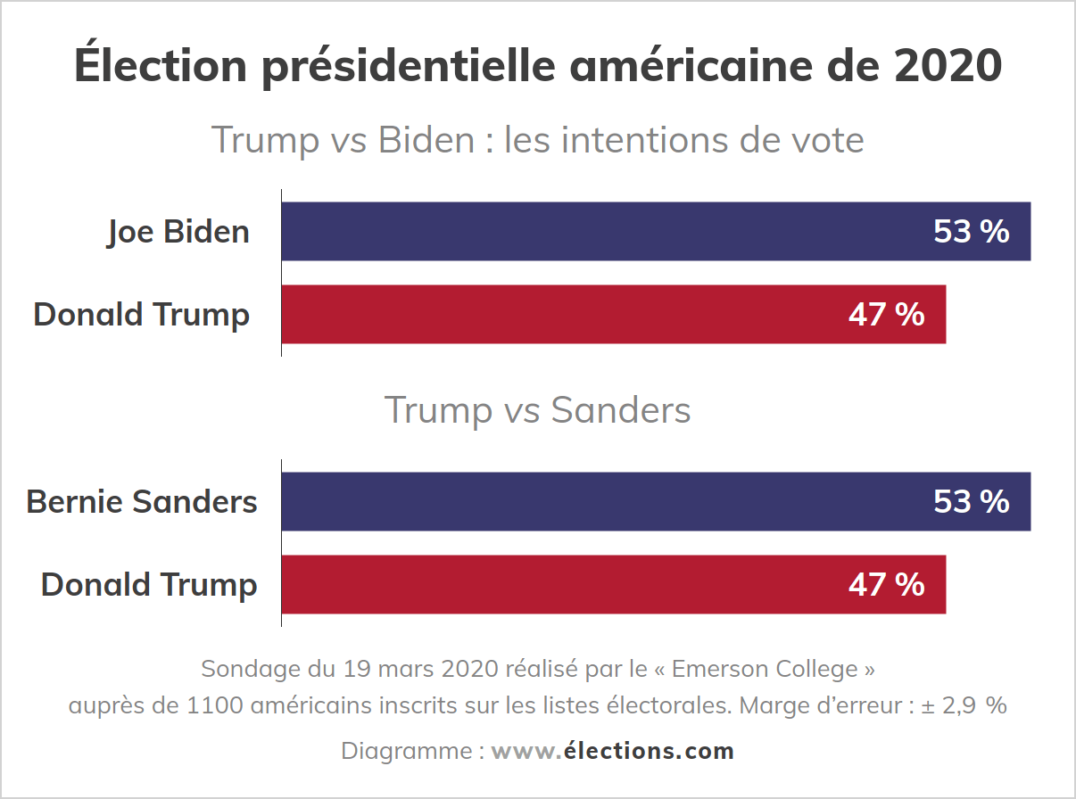 Le sondage, qui a été réalisé par le « Emerson College », a été effectué entre le 18 et le 19 mars auprès de 1100 américains inscrits sur les listes électorales, la marge d’erreur est de 2,9 points.